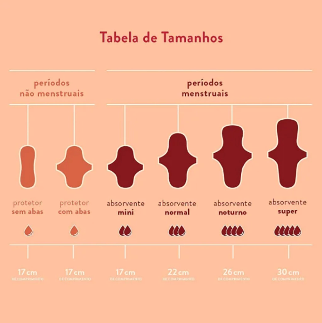 Protetores de Calcinha: medem cerca de 17 cm, são 100% saudáveis e respiráveis, e ideais para usar em períodos não menstruais de excesso de secreção vaginal ou durante a gravidez. Todas as camadas são puro algodão. Possuem camada externa 100% algodão, recheio com 1 camada absorvente e camada interna na linha Conforto Natural (entenda a diferença entre as linhas abaixo).